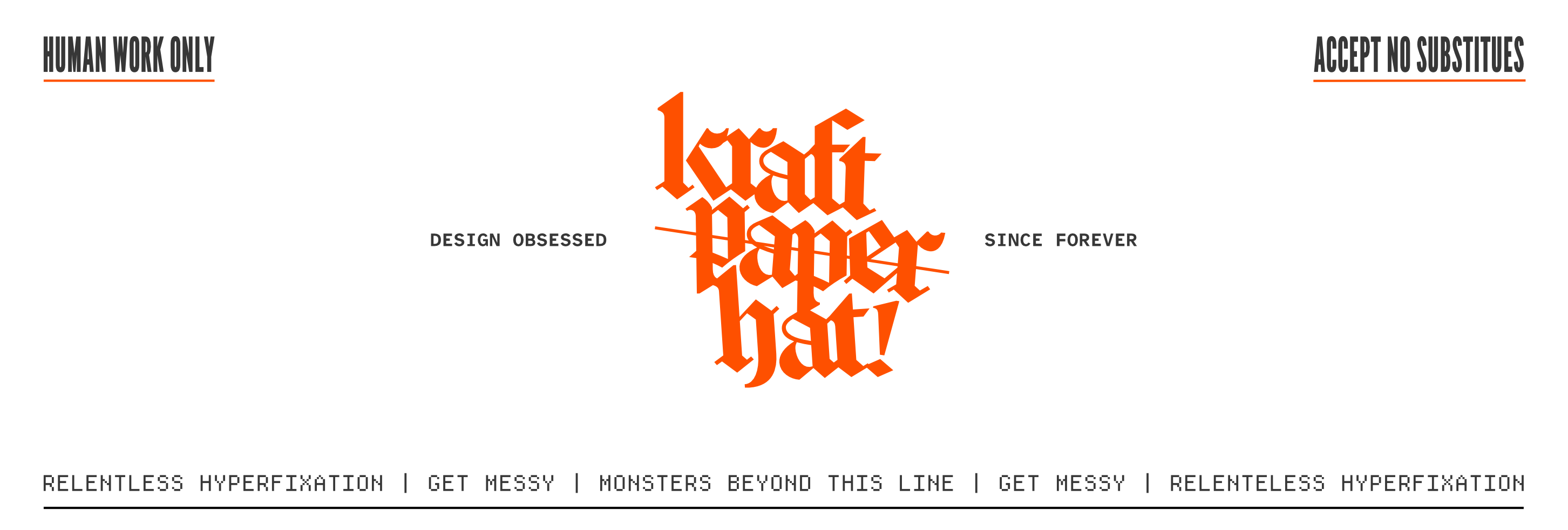 BANNER ALT TEXT: Kraftpaperhat. Design obsessed since forever. Human work only. Accept no substitutes. Relentless hyperfixation. Get messy. Monsters beyond this line.